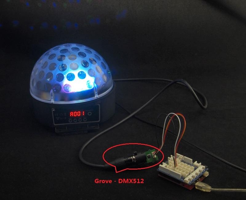 Connect DMX512 interface of Grove - DMX512 to the DMXIN interface of the LED crystal magic ball light using a DMX cable. And power for the LED crystal magic ball light.