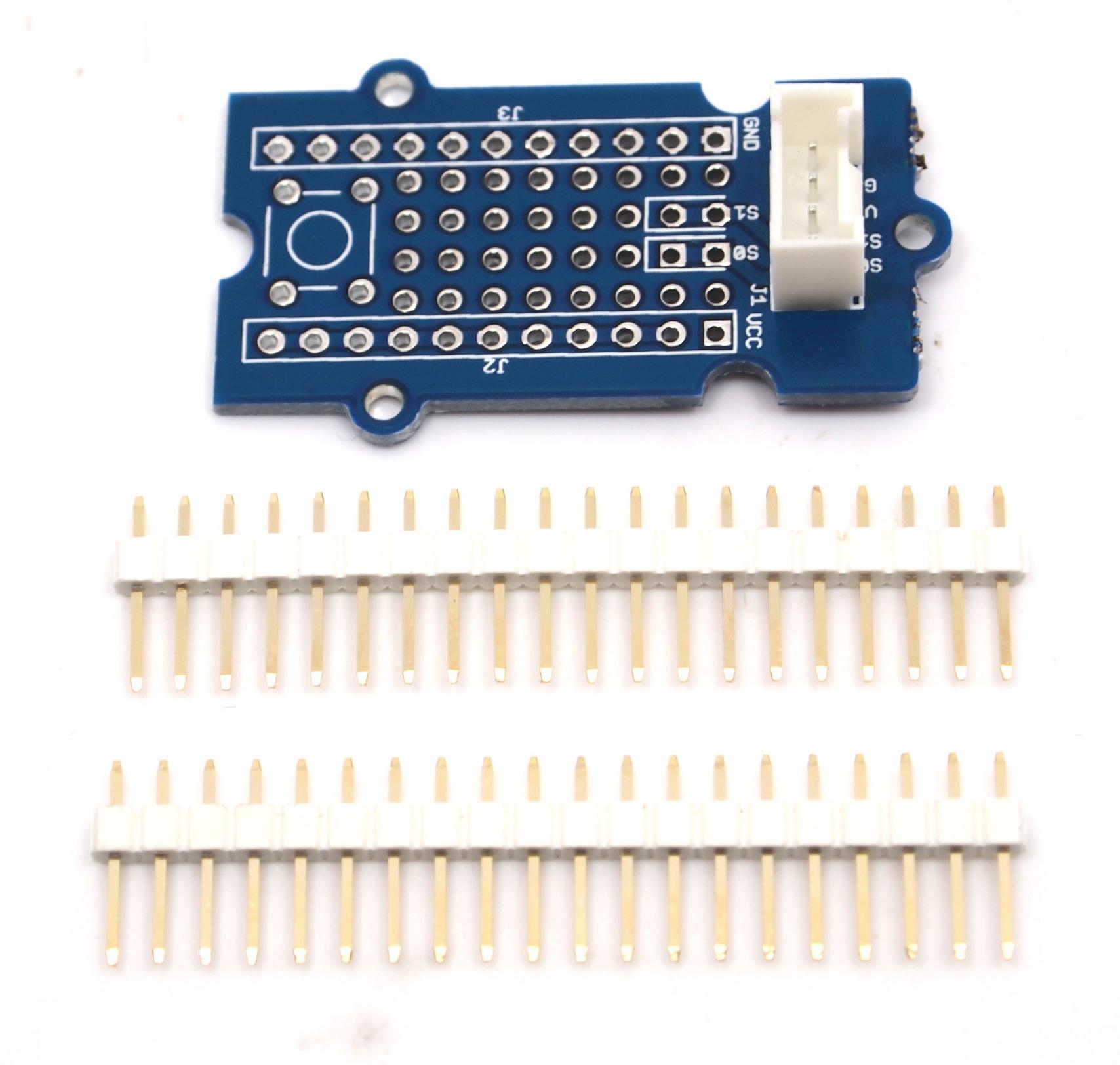 This Grove allows you to add your own circuitry or components to your Grove system prototypes. It gives you access to all four lines from the grove connector cable – S0, S1, VCC and GND. There is also a reserved space for a normally-open button. Standard 2.54mm spacing makes it easy to install normal DIP-format ICs and other components onto the board.