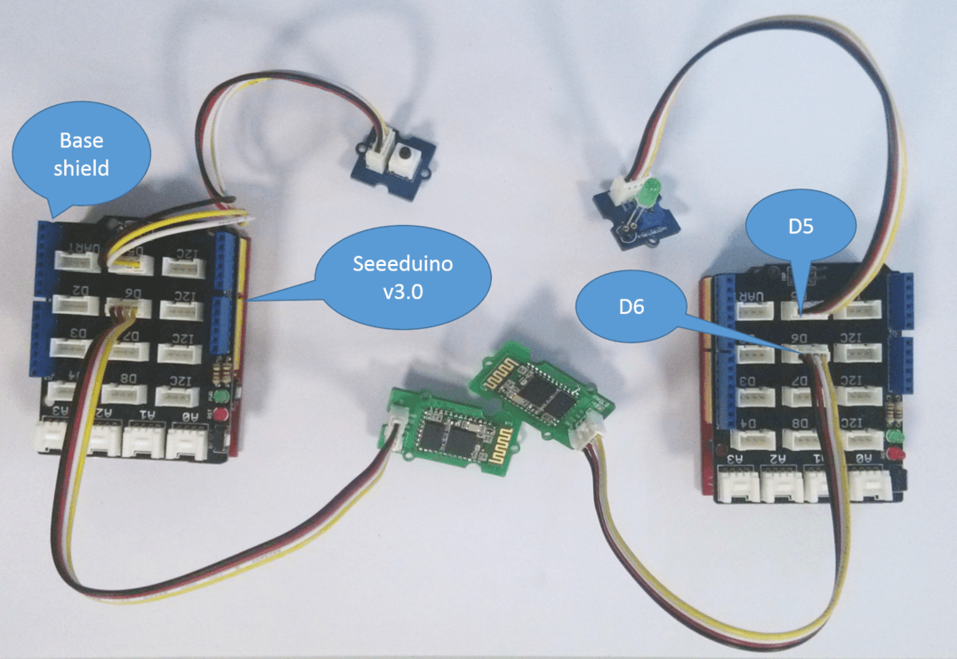 Open Arduino IDE, open File -> Examples -> Bluetooth_Shield_V2_Demo_Code -> Slave_led, then you open the code of Slave and modify the code as well like above.