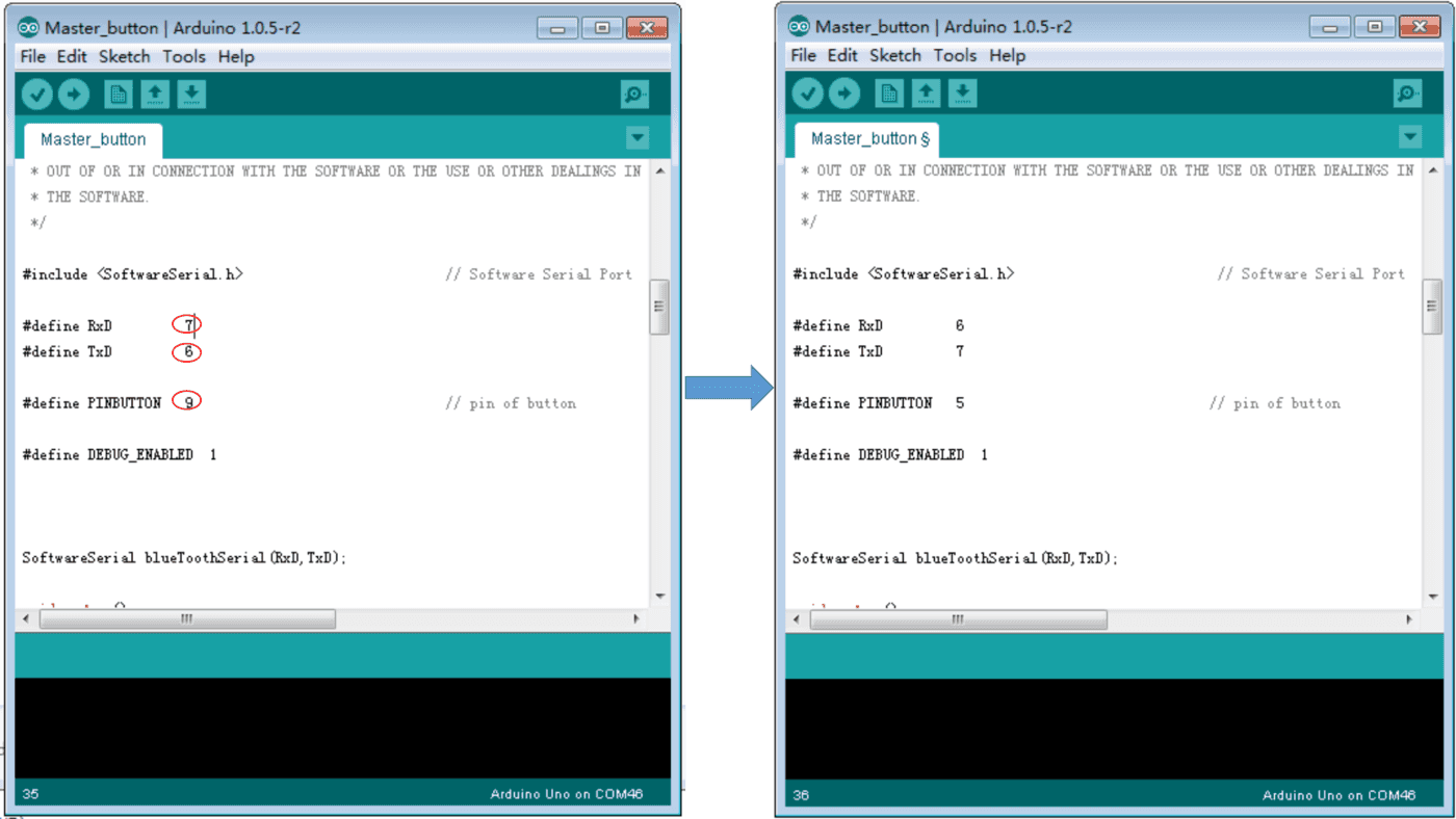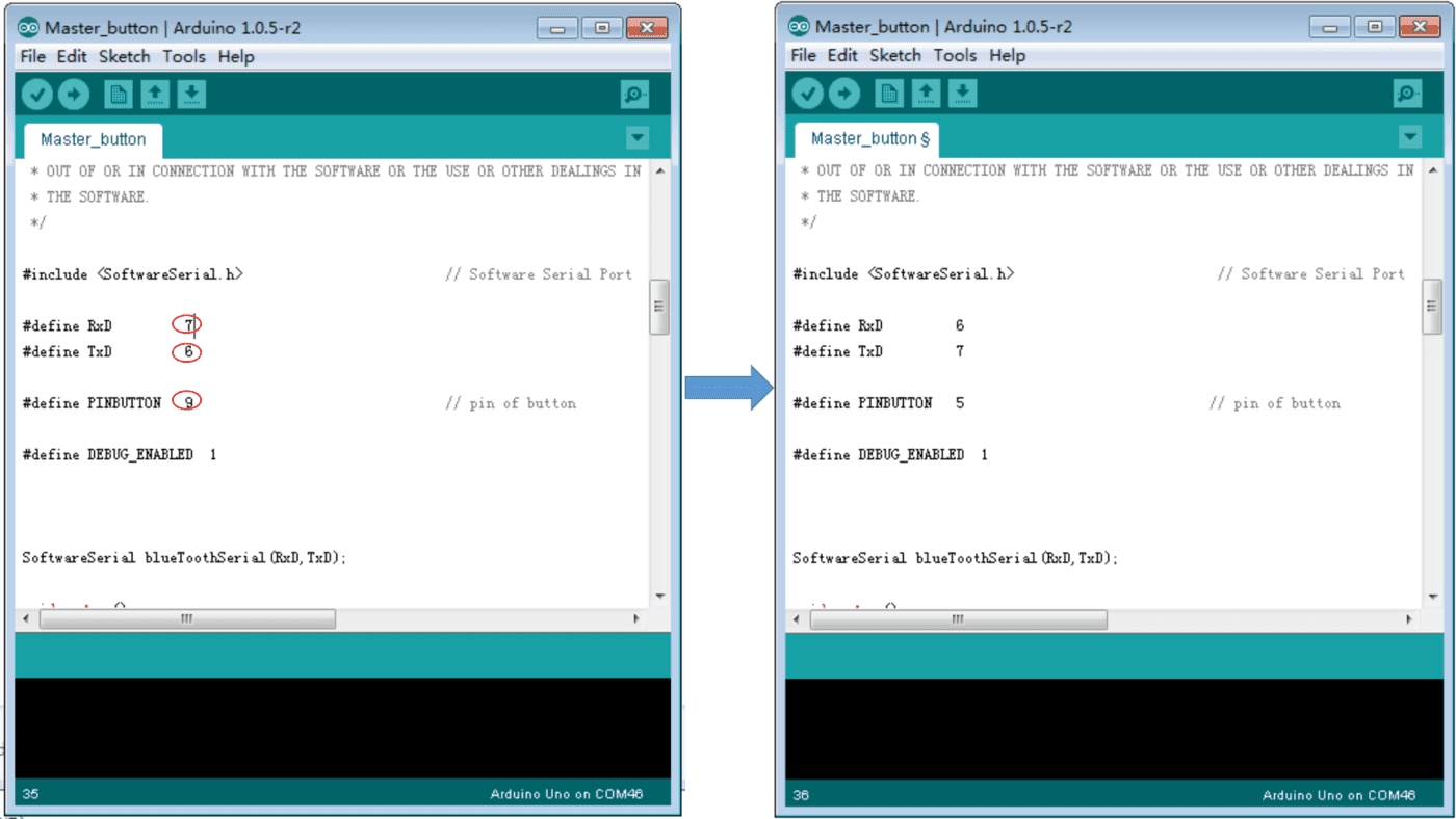 Open Arduino IDE, open File -> Examples -> Bluetooth_Shield_V2_Demo_Code -> Master_Button, then you open the code of Master,modify the code as follows:
