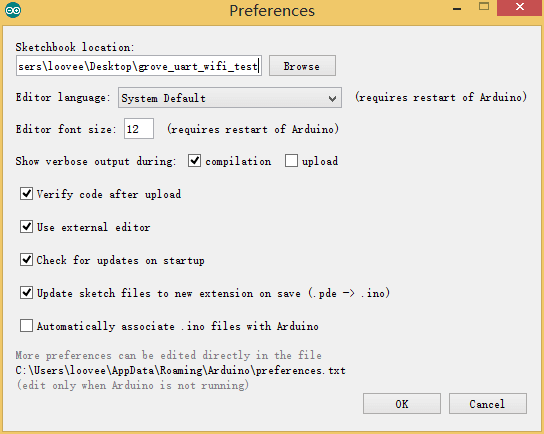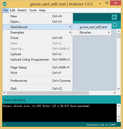 After configurations, please restart Arduino, click File>Sketchbook and choose grove_uart_wifi_wiki after which testing code will show up.