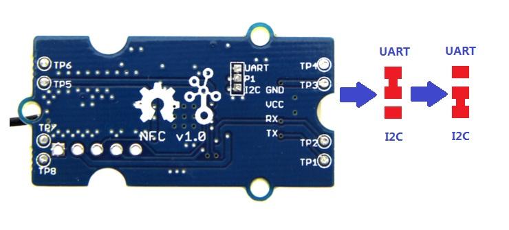 We used I2C interface in the libraries of NDEF, so please cut off the connection between P1 and UART via a little knife, and solder P1 and I2C together.