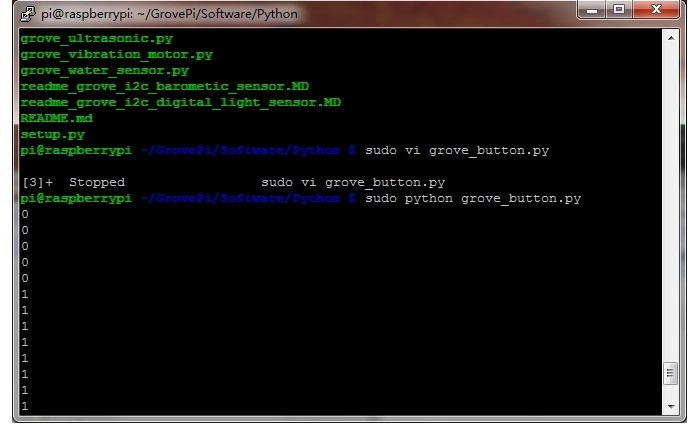 This is a simple example of Raspberry Pi. Run Program and press button, it will print 1 on the terminal, else print 0. Such as the picture below.