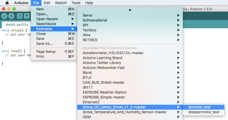 Simply copy the Grove_I2C_Motor_Driver_v1_3 folder to your Arduino library collection. For example, arduino-1.6.12/libraries. Next time you run the Arduino IDE, you'll have a new option in Sketch -> Include Library -> Grove_I2C_Motor_Driver_v1_3. Review the included examples in Grove_I2C_Motor_Driver_v1_3. We provide both DC and stepper motor control examples.