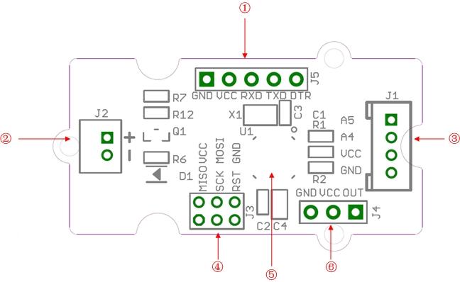 ① UartSBee Interface: Use this interface to change the microcontroller code. Use a [UartSBee](/UartSBee_V4) module to connect to the microcontroller using the Uart interface.② JST 2.0 Interface: Used to connect to a 3.3 volts DC motor(only 3.3 volts)③ Grove Interface④ ICSP Interface⑤ Atmega168 Microcontroller⑥ Servo Interface