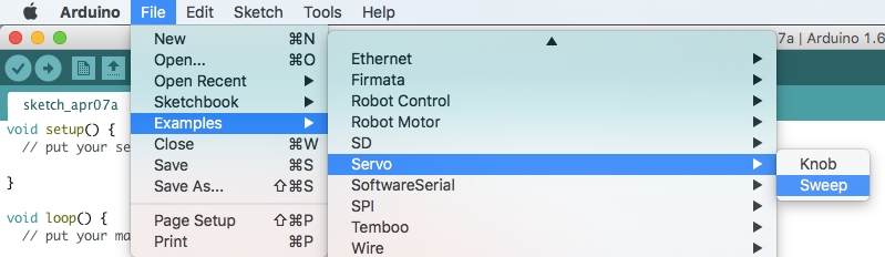 Open the code directly by the path: File -> Examples ->Servo->Sweep.