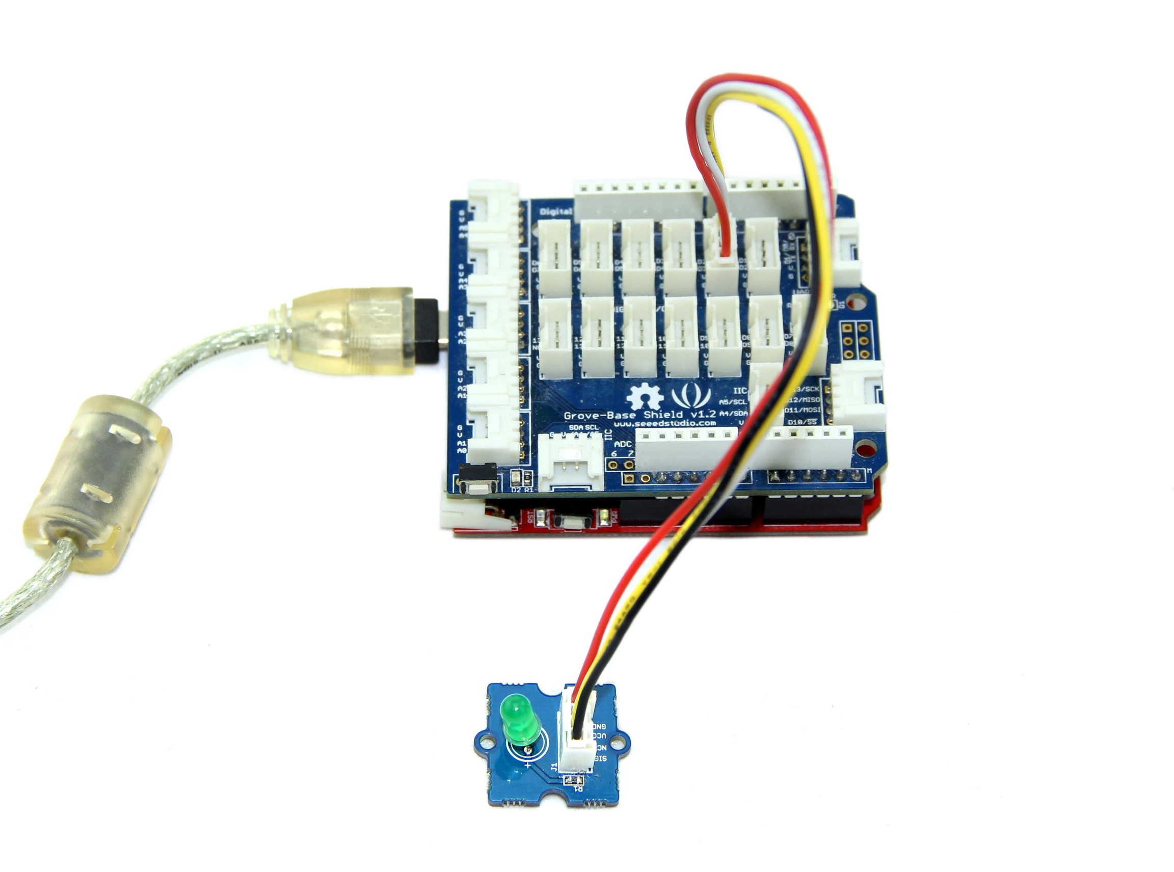 1.Connect the LED to Base Shield's digital port 2 with 4pin Grove Cable.Of course you can change to other valid digital ports if it's necessary and the definitions of the port should be changed too.