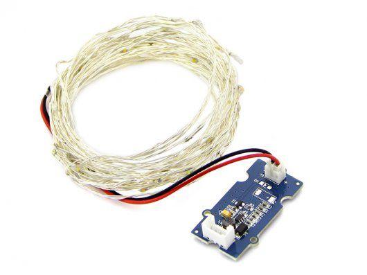 The Grove - LED String Light module is essentially an LED driver for the LED string lights included in the pack. Working voltage of the module is 3.3V/5V. However, the LED string lights require a working voltage of 12V. Therefore, this module uses a AIC1896 current mode step up DC-DC Converter to provide the requisite voltage to the LED string lights. The LED string light is 5 meters in length and has 50 RGB LEDs on it connected equidistant to one another. You can use these to dress a Christmas tree, light your party or to decorate your room.