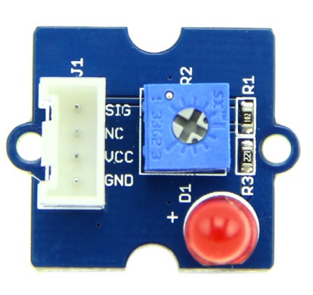 Grove - Red LED is similar to the Grove - LED module in that it houses an LED light source. In addition, it also has a potentiometer on-board to manage the power requirements of the LED. The PCB of this module has mounting holes using which it can be mounted on the required surface for your prototype. For example, it can be easily used as a pilot lamp for indicating power or signal presence.