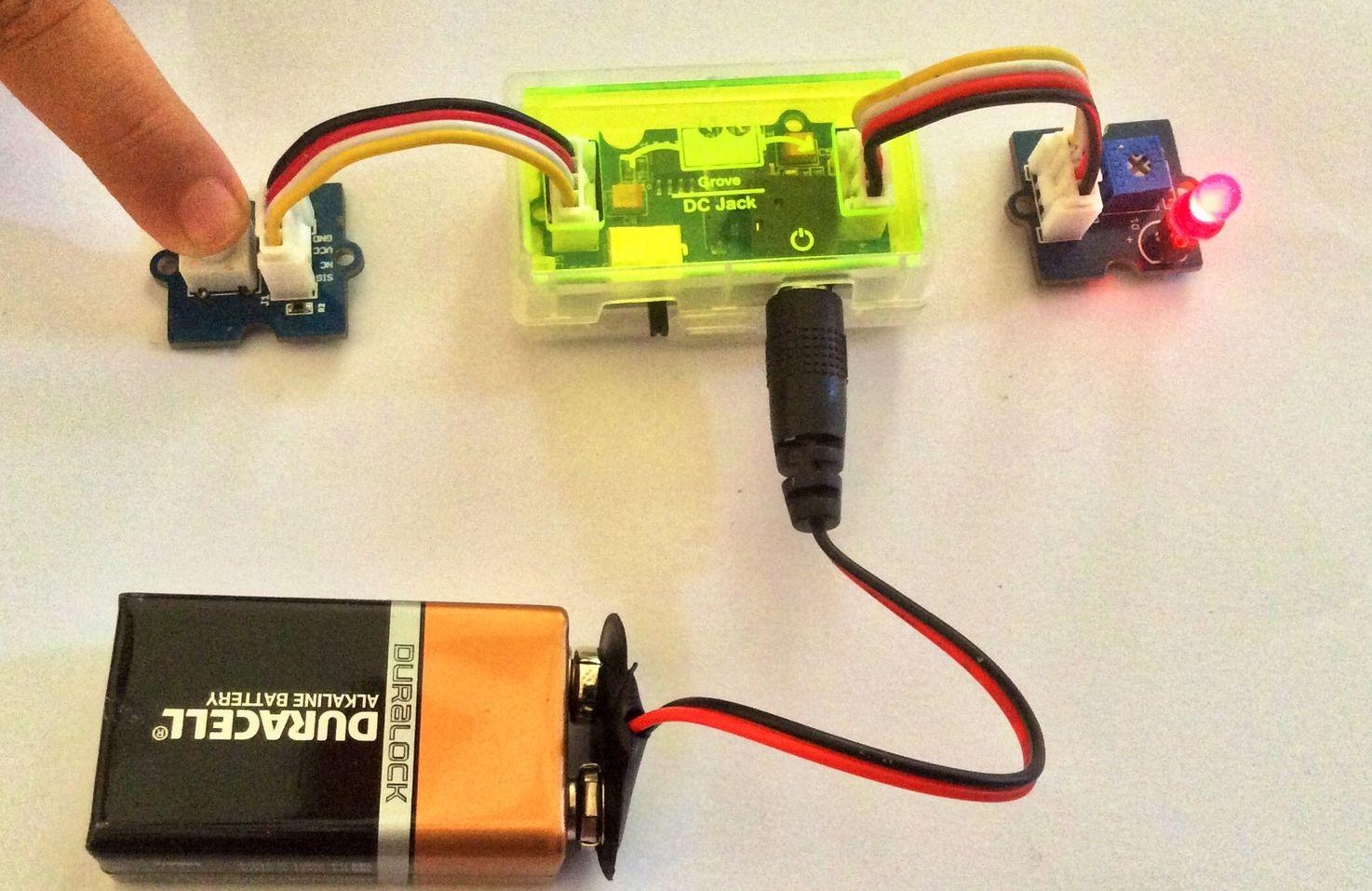 1.Connect the LED module to the output side of your circuit (to the right of the power module). On the input side of the circuit, you may use a range of sensor based input modules (Grove - Light Sensor, Grove - Sound Sensor, Grove - Button or Grove - Slide Potentiometer).