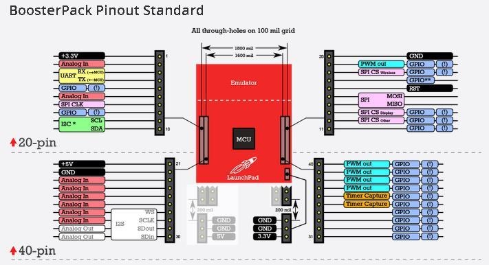 The BoosterPack was designed in a way to leverage pins in the “inner 20 pins” [21-40]. The pins are connected as shown below in the table: