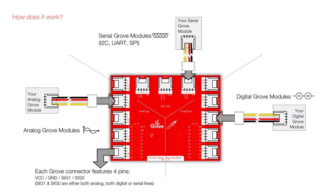 The LaunchPad is a set of Evaluation Kits from Texas Instruments. To introduce new functionality to the LaunchPad evaluation kits, we present the BoosterPack which acts as a plug-in board that fit on top of the LaunchPad baseboards. It offers a convenient and easy way for you to use more than one hundred Grove modules with standardized connectors, including sensors, actuators, displays, lights, motors and so on.