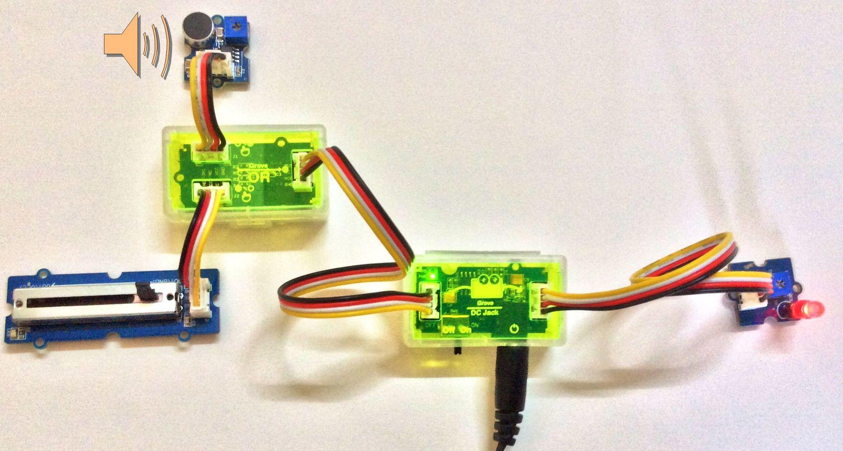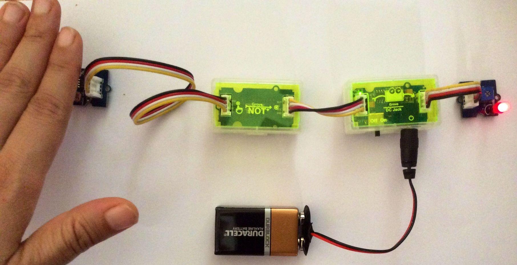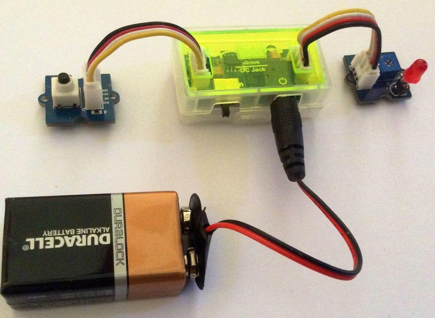 You now have completed building your Grove circuit. Turn back ON the ON/OFF switch on the Grove - DC Jack Power module now and watch your circuit come alive!
