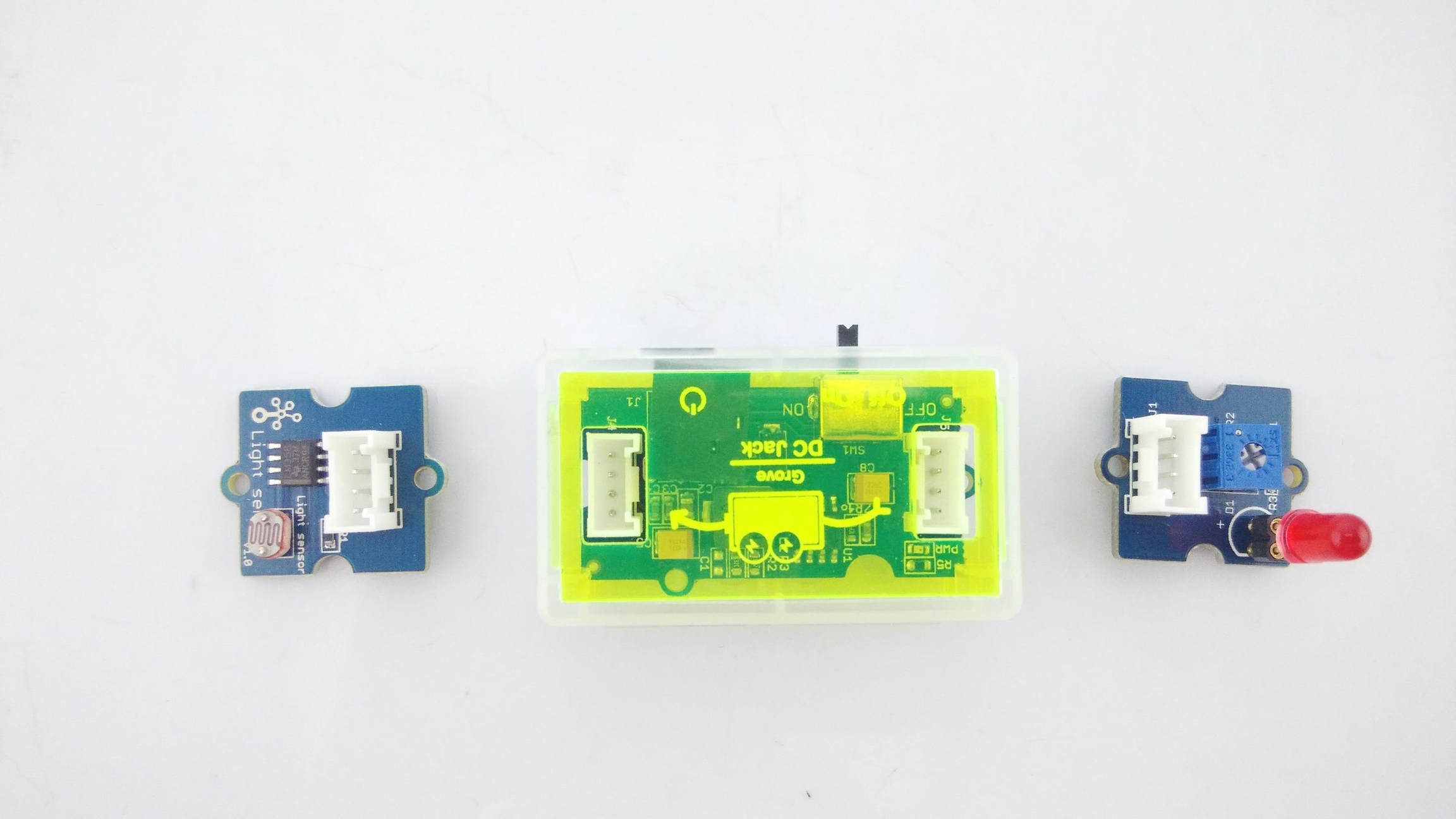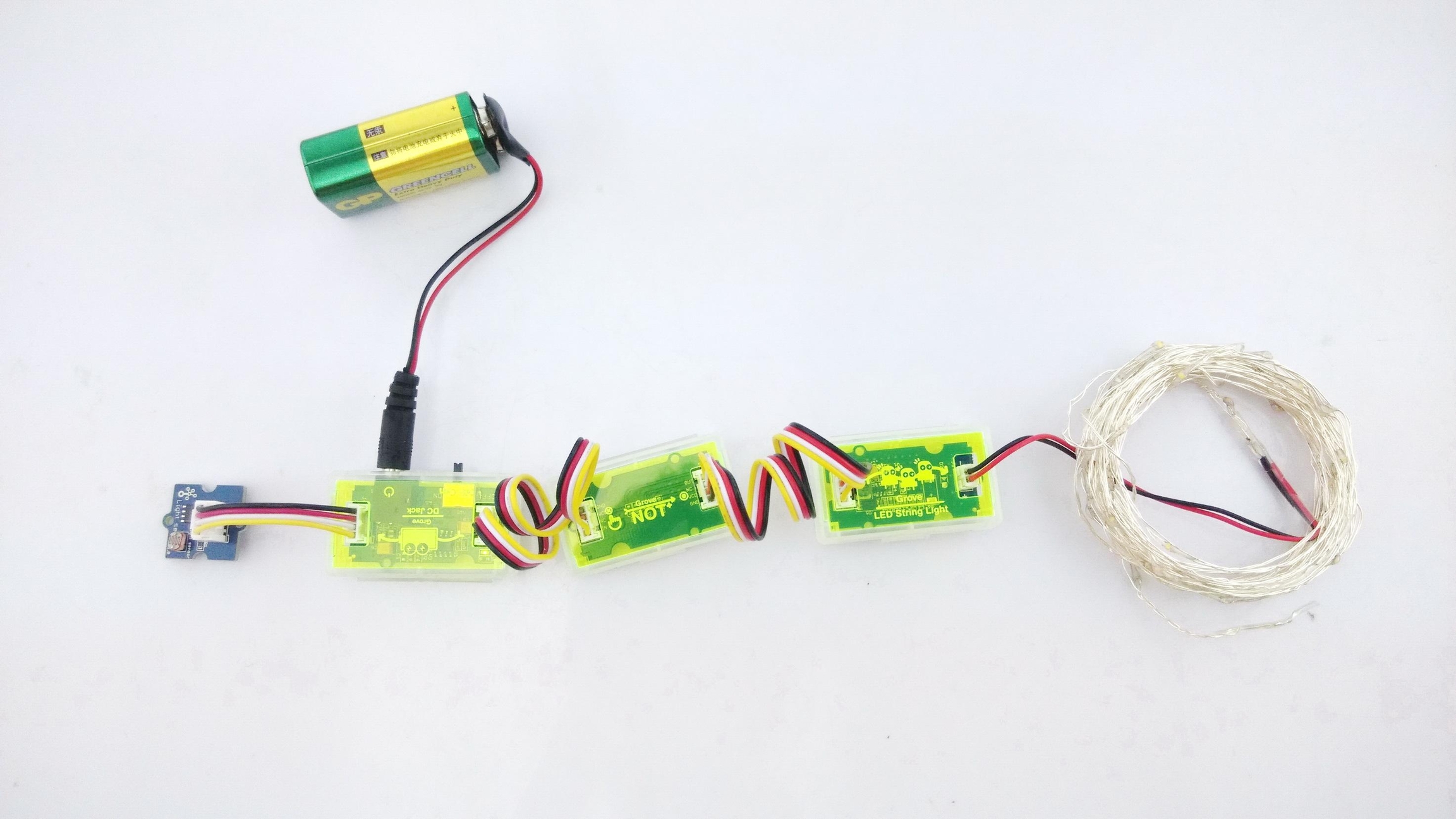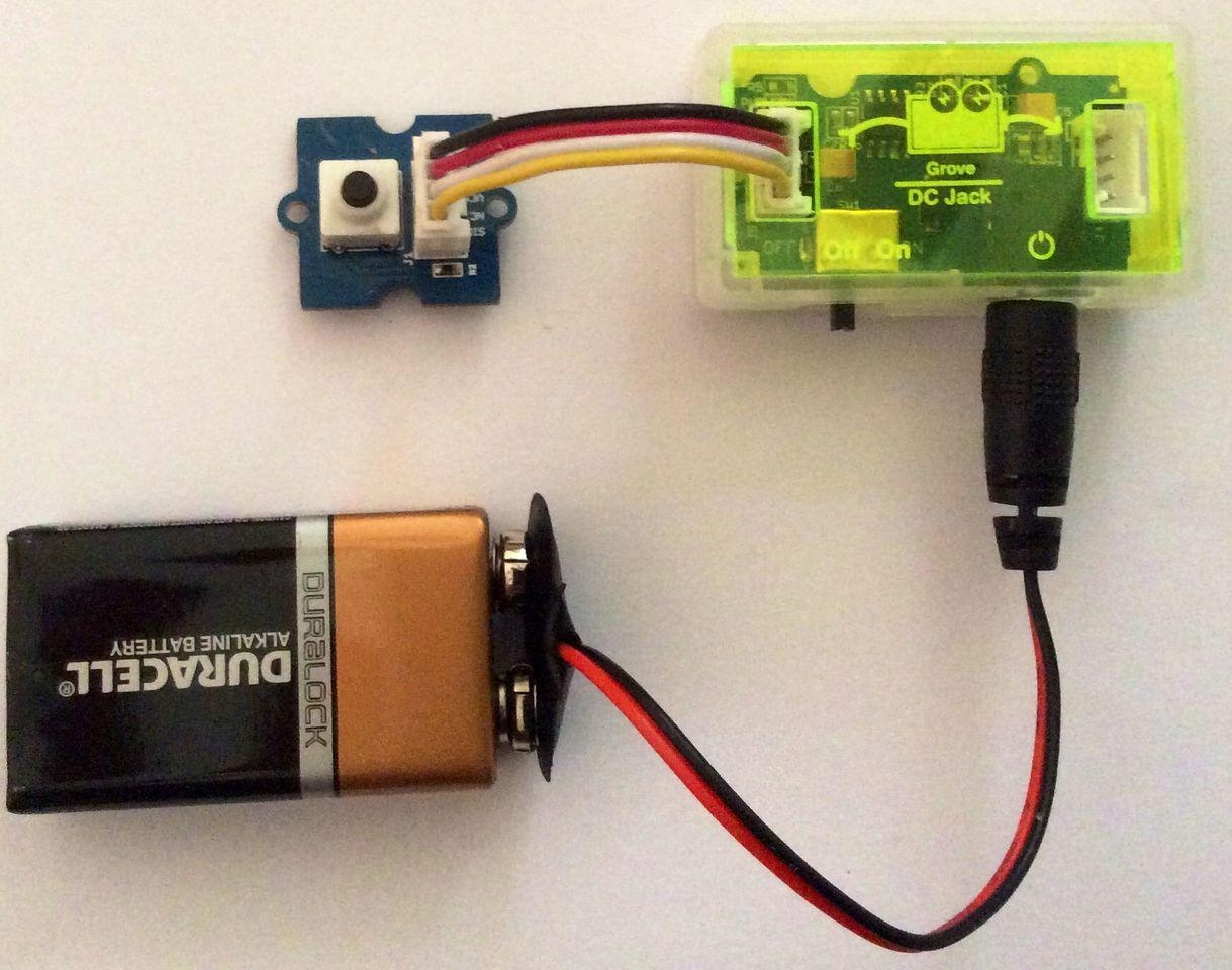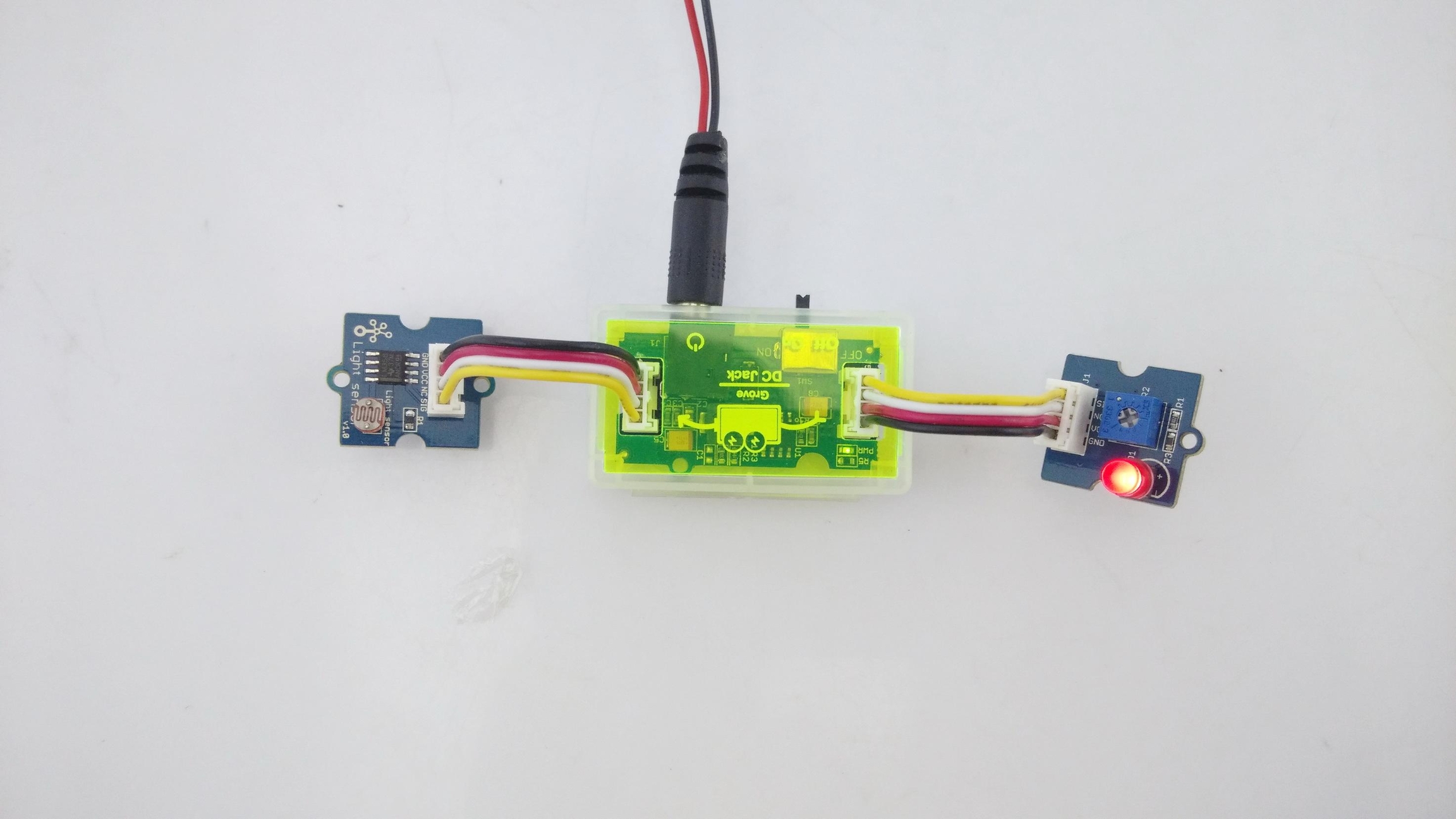 You now have completed building your Grove circuit. Turn back ON the ON/OFF switch on the Grove - DC Jack Power module now and watch your circuit come alive!