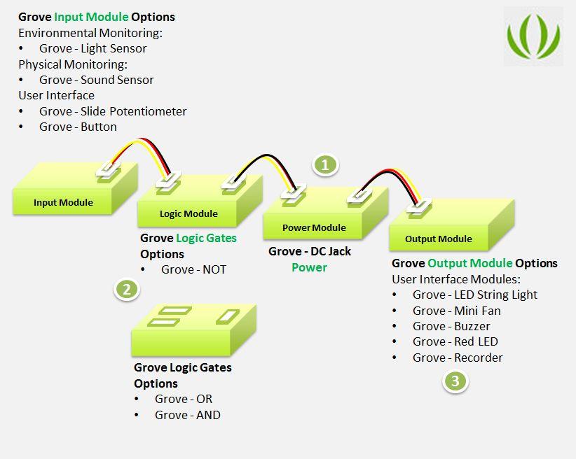 1. Power Modules These supply power to the circuit. The [Grove Mixer Pack V2](http://www.seeedstudio.com/depot/Mixer-Pack-V2Electronic-blockswithout-Arduinoplug-and-play-system-p-1867.html?cPath=14) includes 1 Power Module - the [Grove - DC Jack Power](/Grove-DC_Jack_Power "Grove - DC Jack Power"). No matter what you are building, you will always need to use this one.2. Input Modules These are typically used to relay sensory inputs into the circuit. The [Grove Mixer Pack V2](http://www.seeedstudio.com/depot/Mixer-Pack-V2Electronic-blockswithout-Arduinoplug-and-play-system-p-1867.html?cPath=14) has 4 Input Modules - a light sensor, a sound sensor, a slide potentiometer and a momentary switch. Based on the inputs received from these modules from these modules, you can choose to trigger an action using an Output Module.3. Output Modules Triggers from the Input Modules can be translated to actions using Output Modules. The [Grove Mixer Pack V2](http://www.seeedstudio.com/depot/Mixer-Pack-V2Electronic-blockswithout-Arduinoplug-and-play-system-p-1867.html?cPath=14) has 5 Output Modules - an LED light, an LED String light, a sound recorder, a fan motor and a buzzer.4. Logic Gates Modules These are used in conjunction with Input Modules and can be used to enhance the logic for triggering a specific output. The [Grove Mixer Pack V2](http://www.seeedstudio.com/depot/Mixer-Pack-V2Electronic-blockswithout-Arduinoplug-and-play-system-p-1867.html?cPath=14) has 3 Logic Gates Modules - one each for AND, OR and NOT gate functions.