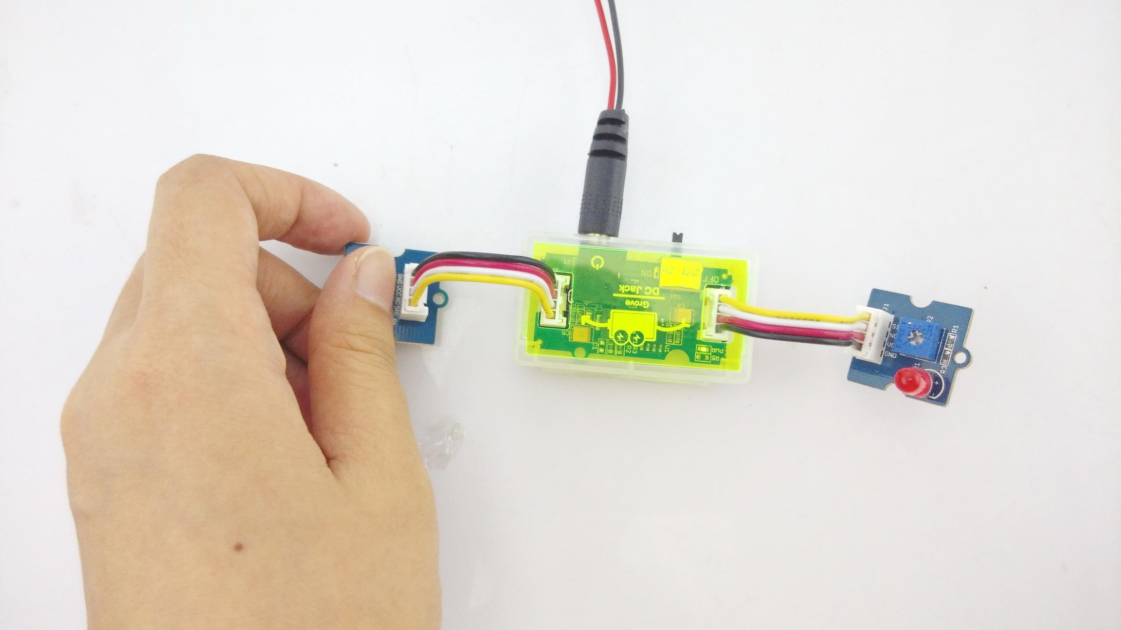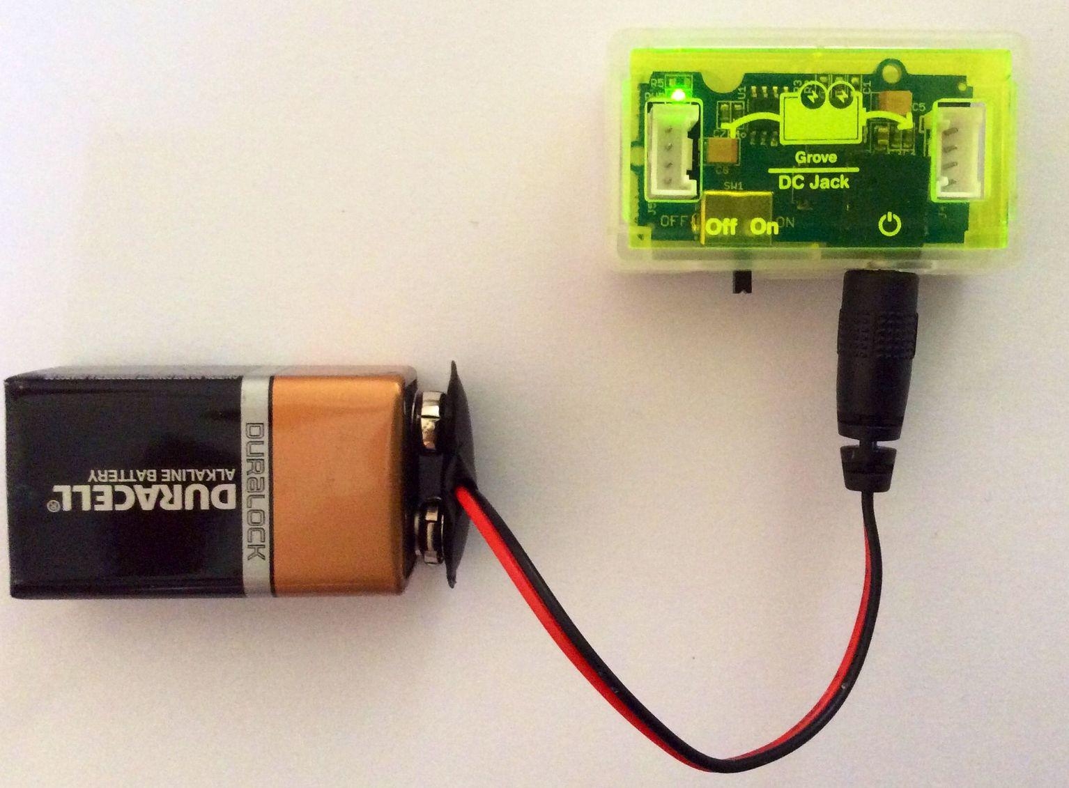 STEP 1 - Connect the Power Module to a power source First of all, connect a reliable power source to the power module. You can use a 9V battery that connects to the [Grove - DC Jack Power](/Grove-DC_Jack_Power "Grove - DC Jack Power") module using the 9V battery connector cable that comes with the pack. Alternatively, you can use a common wall power adapter such as a 5V/1A adapter used for charging cell phones. Once you have connected the Grove power module to a power source, turn the ON/OFF switch on the module to ON position. A green LED on the board of the power module should light up. If this does not happen, double check your connections and power source. If the green LED lights up, this means you have a reliable working power source. Turn the switch back to OFF position now and proceed to the next step.STEP 2 - Connect the Input Module to the Power Module Using a 4-Pin Grove cable, connect the input module you wish to choose for your circuit to the power module. Place the power module in front of you and place the input module to the left of the power module. Then using a 4-Pin Grove Cable, plug one end of it into the input module and the other end into the left-side Grove connector of the power module. For example, to use a momentary switch to turn on and off an LED, connect the [Grove - Button](/Grove-Button "Grove - Button") module to the left-side of the power module using a 4-Pin Grove Cable. The input module could either be directly connected to the power module or via a Logic Gate module.STEP 3 - Connect the Output Module to the Power ModuleUsing a 4-Pin Grove cable, connect the output module you wish to choose for your circuit to the power module. Place the power module in front of you with the input module already connected to the left-side of the power module. Then using a 4-Pin Grove Cable, plug one end of it into the output module and the other end into the right-side Grove connector of the power module. For example, to build a circuit that lights up an LED, connect the [Grove - Red LED](/Grove-Red_LED "Grove - Red LED") module to the right-side of the power module using a Grove Cable. Output module always connect directly to the power module in this way.