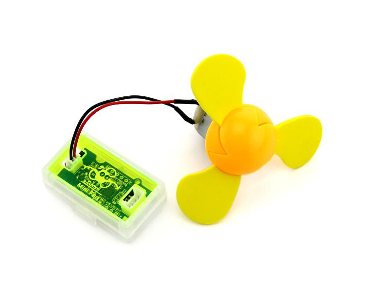 The Grove - Mini Fan module is a DC motor driver based on the AVR Atmega168 microcontroller. It can be used to run the DC motor that is included in your mixer pack. The soft-leaved fan also included in the pack can be attached to the motor make a fun project with kids. Being soft-leaved, the fan is completely safe and there is no chance of any injury. For advanced projects, the microcontroller on this module can also be re-programmed to run a servo motor as well.