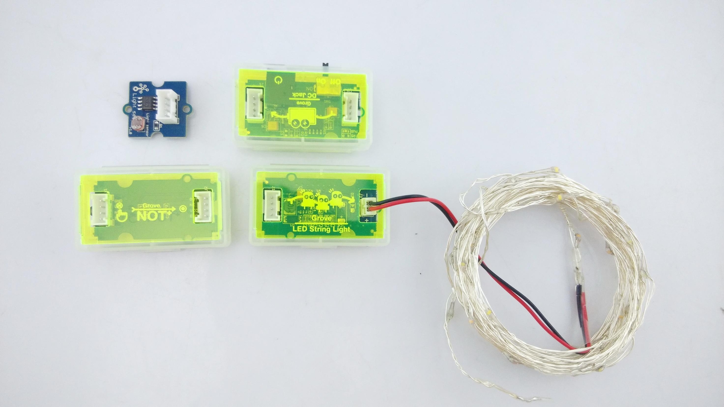 The Grove - LED String Light module is essentially an LED driver for the LED string lights included in your mixer pack. Working voltage of the module is 3.3V/5V, but the string light requires an input of 12V. This module therefore uses a step up DC-DC Converter to provide the requisite voltage to light up the LED string lights. The accompanying LED string light is a 5 meters long RGB LED String light that you can use to light up a Christmas tree, or decorate a part of your home.
