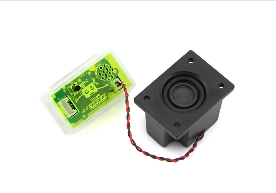 The Grove - Recorder module can record 8-20 secs of audio and play it back. The default recording time is 10 secs. The module uses non-volatile storage, which means that the recorded sound or audio is not lost when the module is switched off. It remains stored in the memory and when the module is switched back on, the same sound or audio can be played again. The module is very easy to control - just press the on-board push button to record and attach the speaker included in the pack to hear the playback.