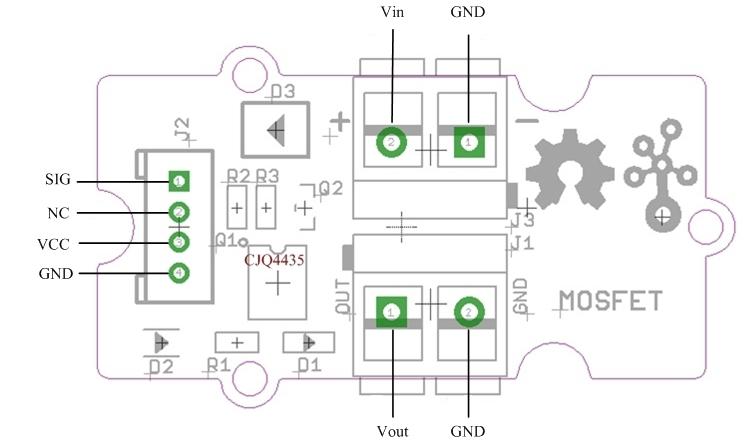 Grove – MOSFET enables you to control higher voltage project, say 15VDC, with low voltage, say 5V, on microcontroller. MOSFET is also a kind of switch, but its switching frequency can reach up to 5MHz, much faster than normal mechanical relay. There are two screw terminals on the board. One for outer power source and the other for device you want to control. Grove – MOSFET will pass the power from one end to another when closed. But if outer power source is absent, your device can still draw power from microcontroller via the Grove interface.