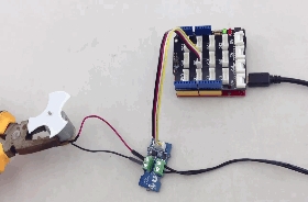 Here we demonstrate how to use Grove - MOSFET to control a motor. We provide power for it with external power source, but if your controlled device needs current smaller than 300mA, Seeeduino can totally support it and no extra power source needed.