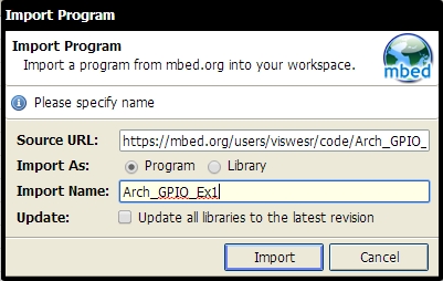 The above program uses DigitalOut class and wait() function of mbed C/C++ SDK. LED1 is an pseudonym of I/O pin P1_8 and is labelled D1 in the Arch board. The state of LED1 is changed by writing either 0 or 1 to led. The wait() function produces a delay in seconds. The state of the led is continuous toggled every 0.5 seconds inside the endless while() loop.