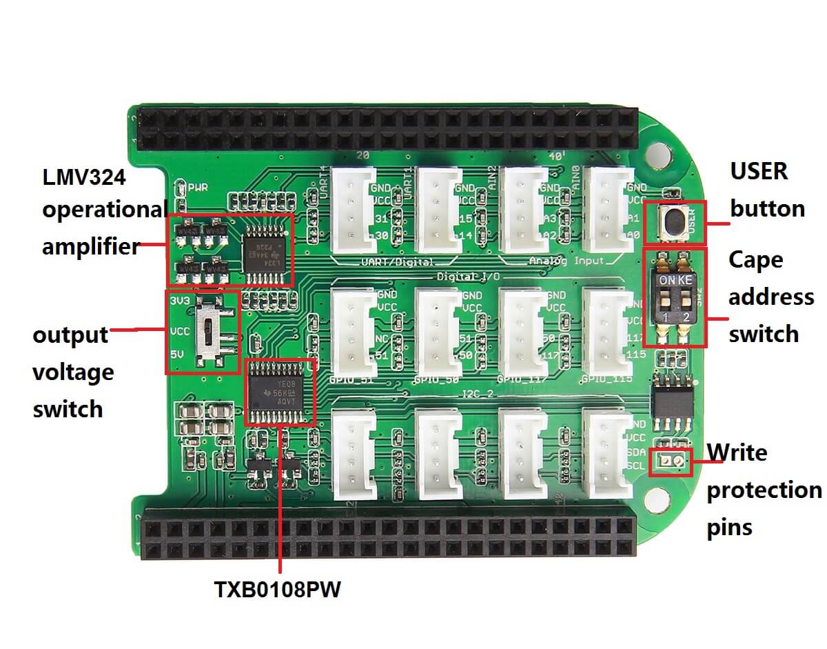 The cape provides 12 easy-to-use Grove connectors to do plug-and-play with the big family of Grove modules. The connectors include 2x UART, 2x ADC, 4x Digital I/O and 4x I2C that interface to the pins on your Beaglebone board, offering almost everything you need. There are two switches used to reset the I2C address in case of address conflicts. The board also integrates a switch for voltage transition - from a normal 5V to 3.3V and vice versa.