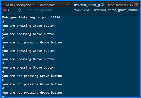 1.Connect BeagleBone Green to Your PC or MAC by USB cable. Click http://192.168.7.2:3000/ide.html to Open Cloud9 IDE. </dd></dl> 2.Connect Grove - Button(P) to Grove Base Cape for BeagleBone v2 with Grove cable. Plug Grove cable to GPIO pin 51.