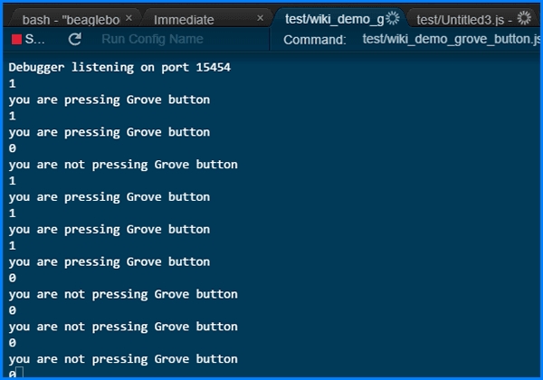 1.Connect BeagleBone Green to Your PC or MAC by USB cable. Click http://192.168.7.2:3000/ide.html to Open Cloud9 IDE. </dd></dl> 2.Connect Grove - Button(P) to Grove Base Cape for BeagleBone v2 with Grove cable. Plug Grove cable to GPIO pin 51. </dd></dl> 3.Copy following code to Cloud9, save it to a .js file.
