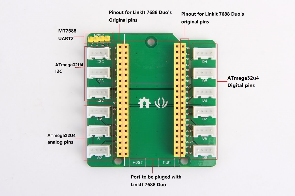 !!!Note As you need to plug LinkIt Smart 7688 Duo on this breakout, align the side with USB micro type-B of LinkIt Smart 7688 Duo to the side with silkscreen Host of Grove Breakout for LinkIt Smart 7688 Duo.