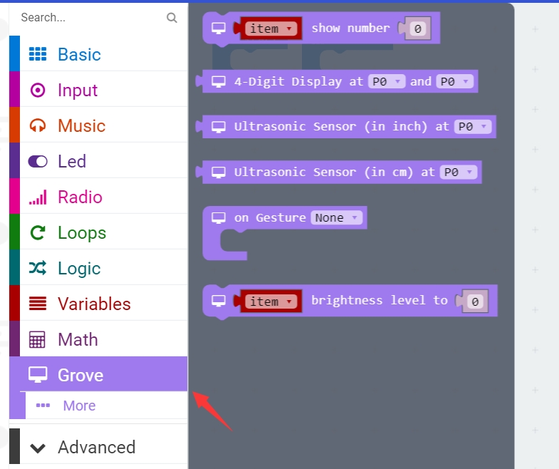 Add basic block forever, then add Grove block item show number 0, rename ‘item’ to ‘Display’, replace ‘0’ with Grove block Ultrasonic Sensor (in cm) at P0.