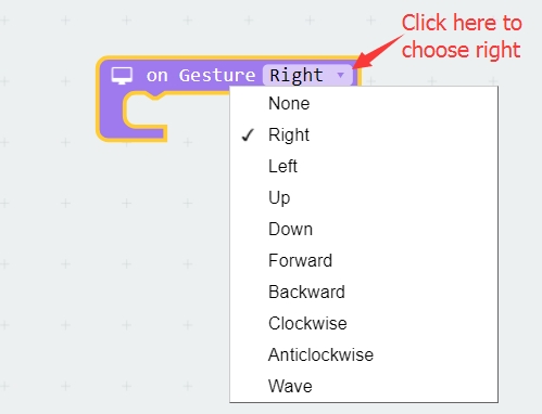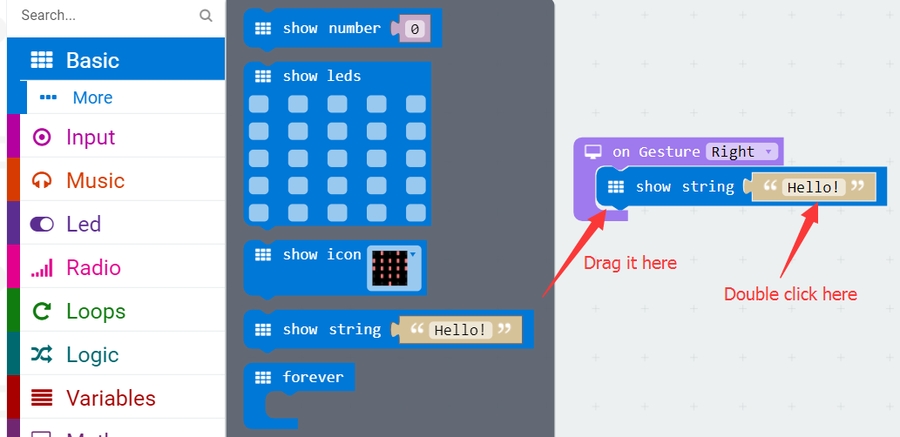 Add Basic block show string and embed it into the Gesture block.Then double click "Hello!", change it to "Right".