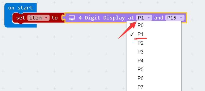Add basic block on start, then add variable blocks set item to 0, rename ‘items’ to ‘Display’. If you have successfully added the Grove package, replace “0”with Grove block 4-Digit Display at P1 and P15.