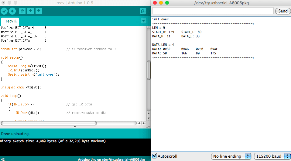 Now open the example file of "recv" : File --> Sketchbook --> libraries --> IRSendRev --> recv.