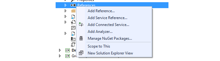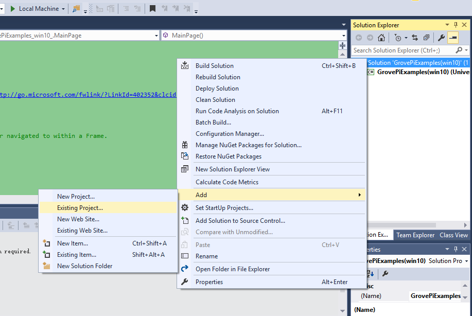 Move the two C# library projects “GrovePi” and “Driver” to the folder where your project resides. And add them to your project in Solution Explorer. For example, right click the Solution “GrovePiExamples ”, Add | Existing Project, as below shows.