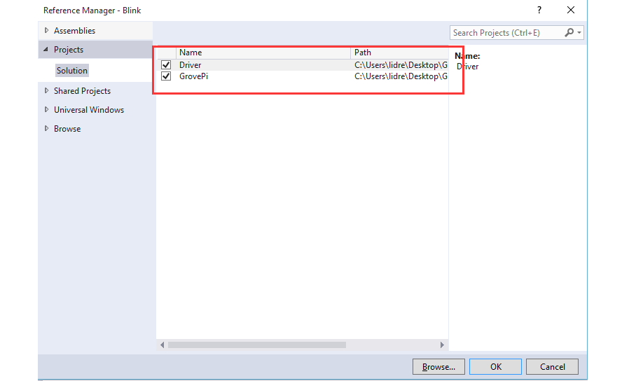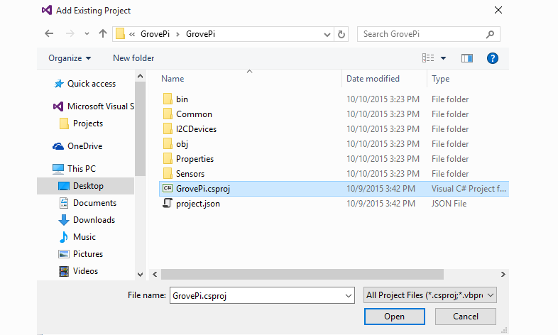 Then add “GrovePi” and “Driver” to the Solution Explorer.