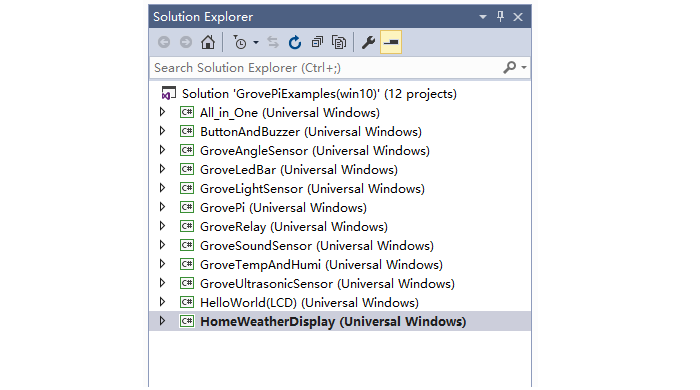 Here we have a list of example projects that show just how easy it is to start a project with the Raspberry Pi. These Raspberry Pi projects combine easy-to-use Grove sensors with the powerful Raspberry Pi. You can click here to download the GrovePi Example code for win10. You will need to press the green button “Clone or download” on the right and choose “Download ZIP”. Then you need to extract the ZIP in a location of your choice. Open the GrovePiExamples(win10).sln with your Visual Studio 2015, you can see there’re 12 projects in the Solution Explorer as the picture below shows.