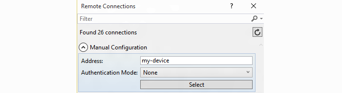 3) At this point, Visual Studio will present the Remote Connections dialog. If you previously used PowerShell to set a unique name for your device, you can enter it here (in this example, we’re using my-device). Otherwise, use the IP address of your Windows IoT Core device. After entering the device name/IP select None for Windows Authentication, then click Select.