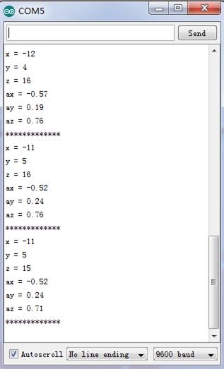 In this program, acceleration information are sent from the sensor to Seeeduino via I2C bus and then Seeeduino printed them onto the serial monitor. Open the serial monitor to check the result.