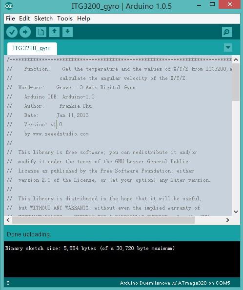 Then open File -> examples -> Grove_3_Digital_Gyro -> ITG3200_gyro, you can open the demo code.