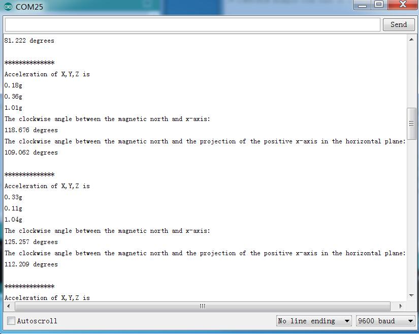 You can see the acceleration values and the clockwise angle between the magnetic north and x-axis.