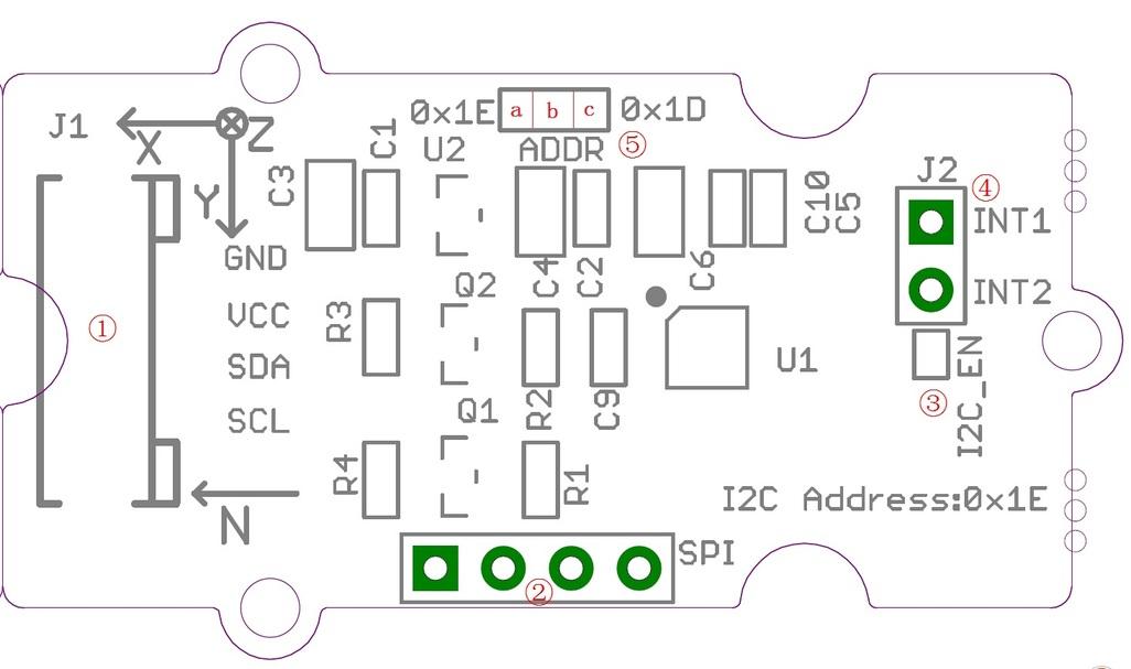 ⑤Address select pad, default connected b and a address is 0x1E, if connect b and c address is 0x1D, if want to use SPI, disconnect this pad to either side.