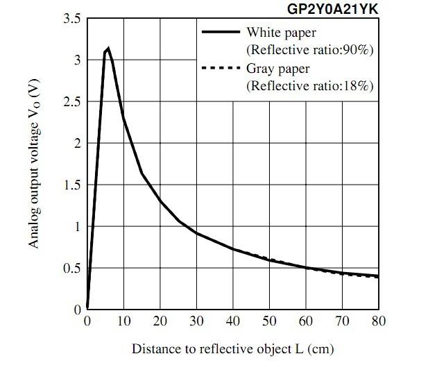 The Infrared Proximity sensor is easy to use. The relationship between the voltage reading and the distance as shown below. When we read the voltage, which indicate the distance from the object in front to this sensor.