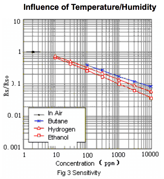 Note The sensor value only reflects the approximated trend of gas concentration in a permissible error range, it DOES NOT represent the exact gas concentration. The detection of certain components in the air usually requires a more precise and costly instrument, which cannot be done with a single gas sensor. If your project is aimed at obtaining the gas concentration at a very precise level, then we do not recommend this gas sensor.