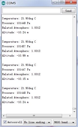 4.Open the serial monitor to receive the sensor's data including temperature, barometric pressure value, relative atmosphere pressure and altitude.