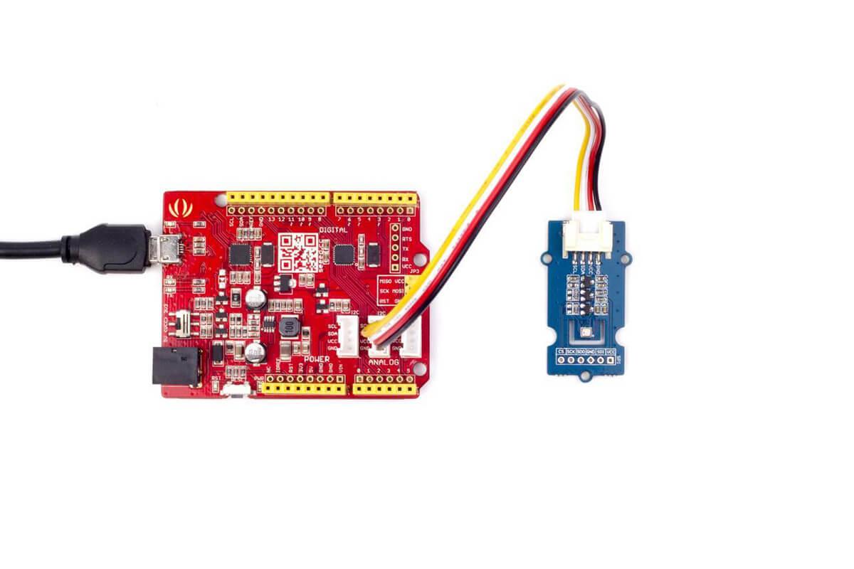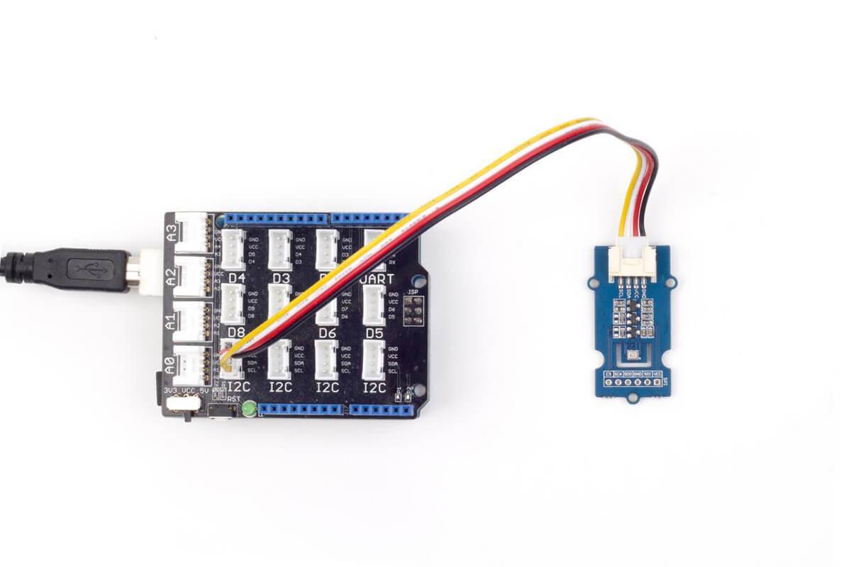 Using the sensor is easy. For Seeeduino (compliant with Arduino), just connect this breakout board using Grove cable to I2C Grove connector. Then, use the provided library and example code from GitHub. If you are using an Arduino either use Base Shield v2.0 or simply connect the VCC pin to the 5V voltage pin, GND to ground, SCL to I2C Clock (Analog 5) and SDA to I2C Data (Analog 4).