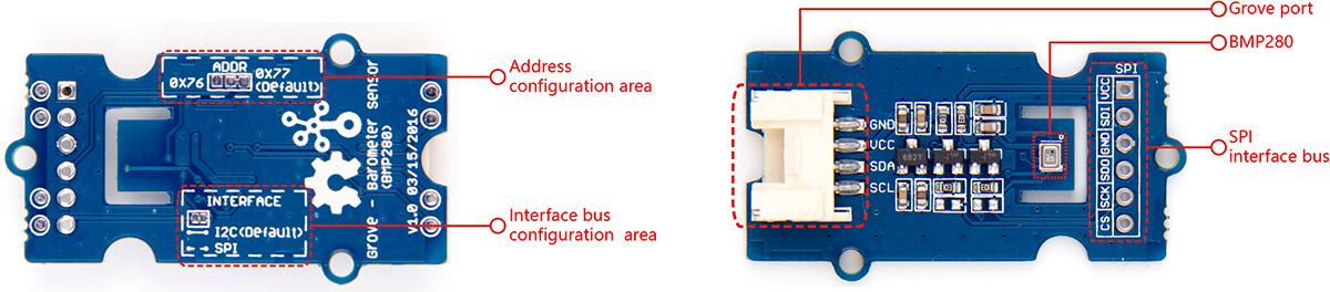 Grove - Barometer Sensor (BMP280) is a breakout board for Bosch BMP280 high-precision and low-power digital barometer. This module can be used to measure temperature and atmospheric pressure accurately. As the atmospheric pressure changes with altitude, it can also measure approximate altitude of a place. It can be connected to a microcontroller with I2C (integrated with Grove socket) or through SPI bus. We have also provided highly abstracted library to make this product easier to use.