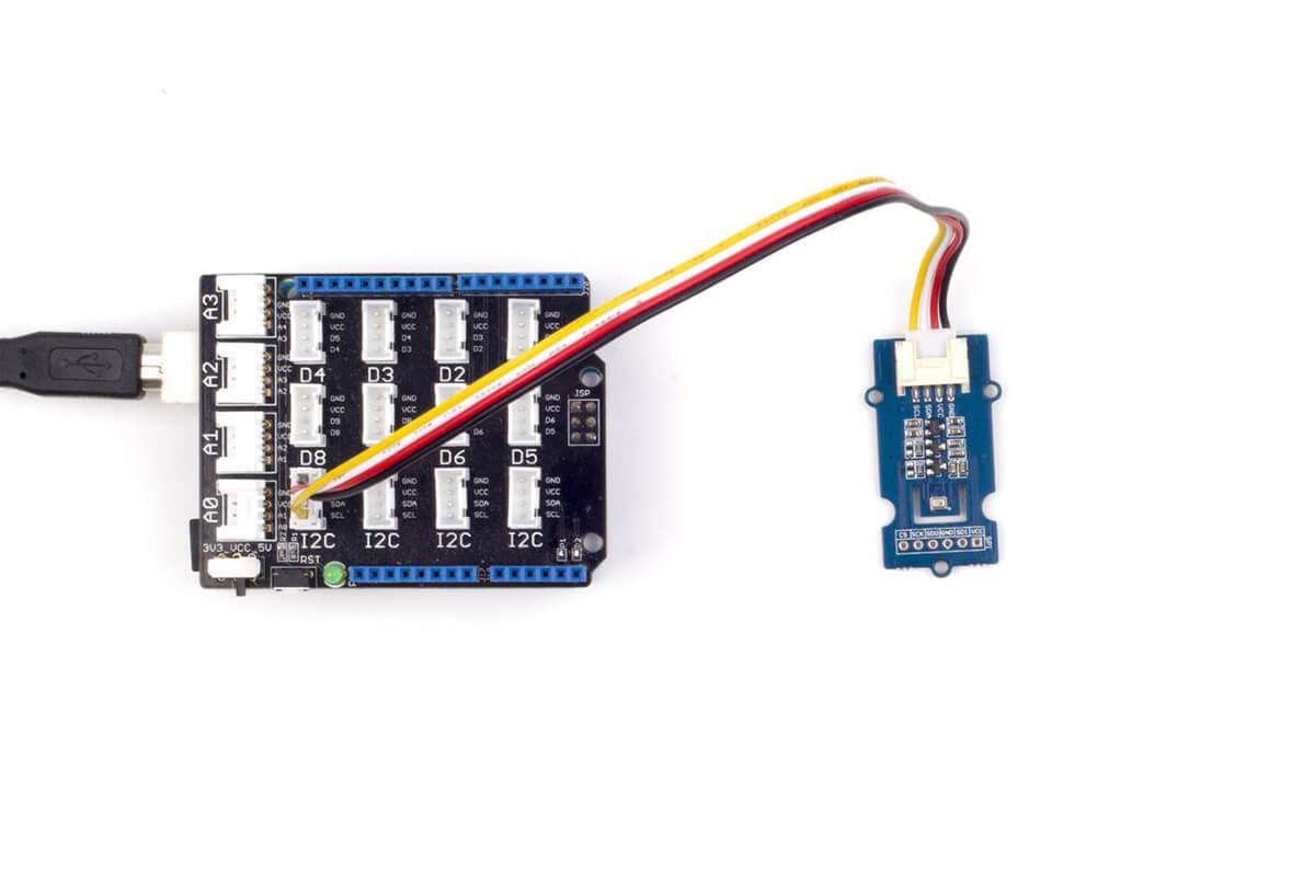 Using the sensor is easy. For Seeeduino (compliant with Arduino), just connect this breakout board using Grove cable to I2C Grove connector. Then, use the provided library and example code from GitHub. If you are using an Arduino either use Base Shield v2.0 or simply connect the VCC pin to the 5V voltage pin, GND to ground, SCL to I2C Clock (Analog 5) and SDA to I2C Data (Analog 4).