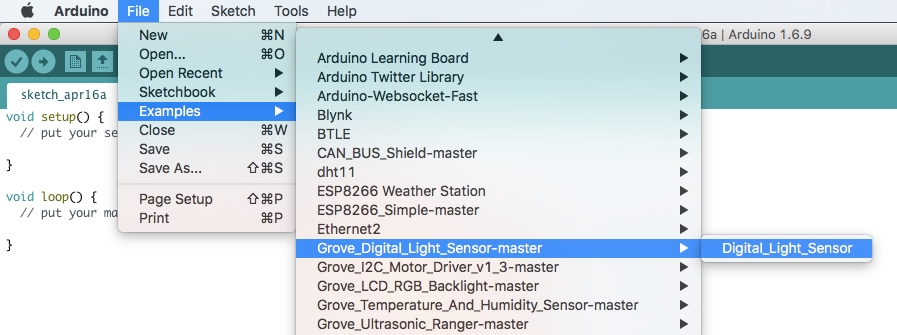 Open the code directly by the path: File -> Example ->Digital_Light_Sensor->Digital_Light_Sensor.