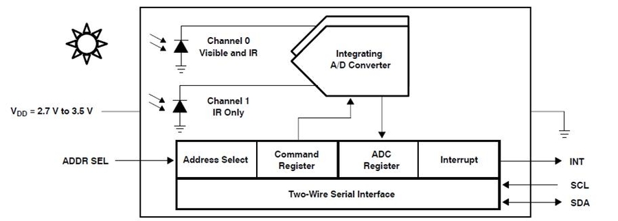 U1: TSL2561 IC, Light-To-Digital Converter. Here is the Functional Block Diagram.